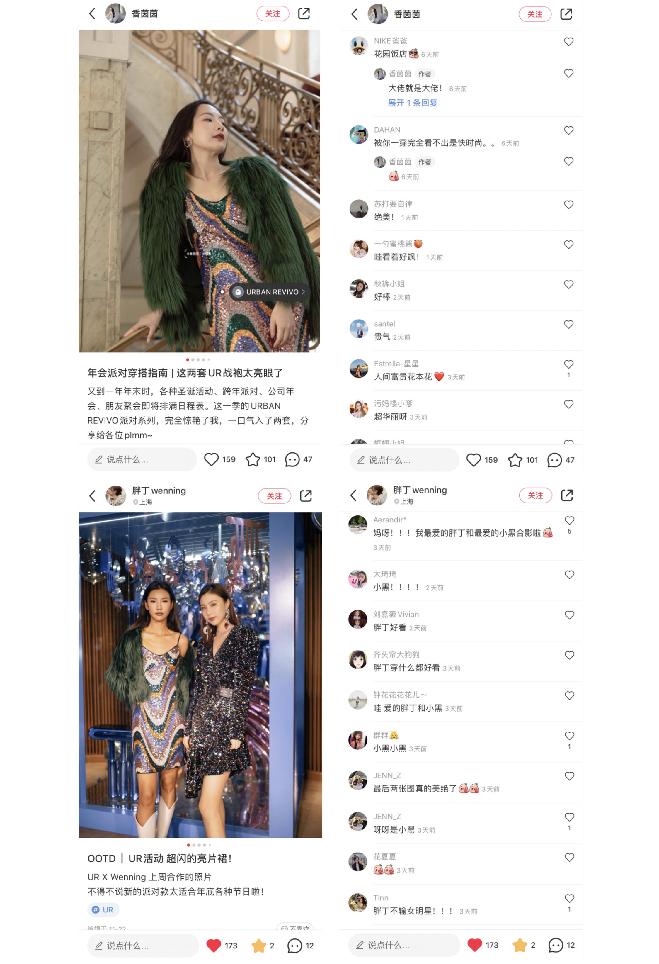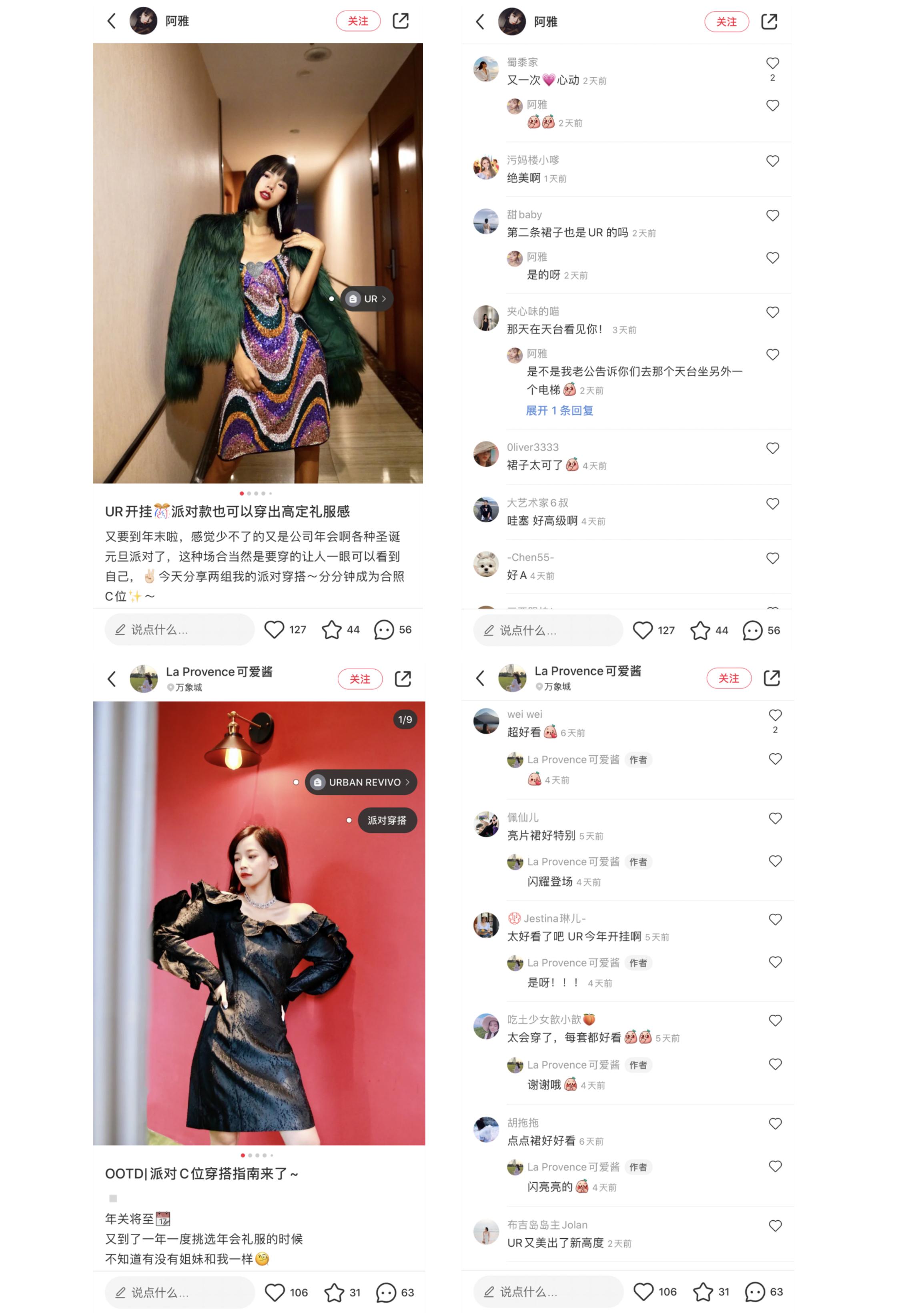 2.若干小紅書達(dá)人筆記持續(xù)占據(jù)關(guān)鍵詞“UR派對”“UR皮草”“UR亮片裙”等相關(guān)內(nèi)容的前幾位展示,從互動評論中可以看出,本次投放引導(dǎo)打卡的轉(zhuǎn)化率在持續(xù)走高,陸續(xù)有素人曬出了新品的穿搭效果,大多數(shù)粉絲渴望打卡、愿意打卡