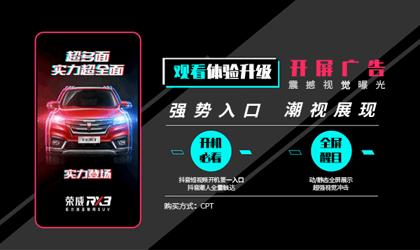 開屏廣告是短視頻短視頻開機(jī)第一入口,是一個(gè)全屏廣告,短視頻潮人全 量觸達(dá),無論是動(dòng)態(tài)還是靜態(tài)的全屏展示都能給人超強(qiáng)的視覺沖擊。 開屏廣告的售賣方式為CPT(廣告主可以選擇在全天24小時(shí)內(nèi)任一 時(shí)間段投放廣告,用戶只要在這段時(shí)間內(nèi)打開短視頻APP,即可看到廣 告。在這一時(shí)間內(nèi)無論廣告展示多少次都不會(huì)收取廣告費(fèi)用)