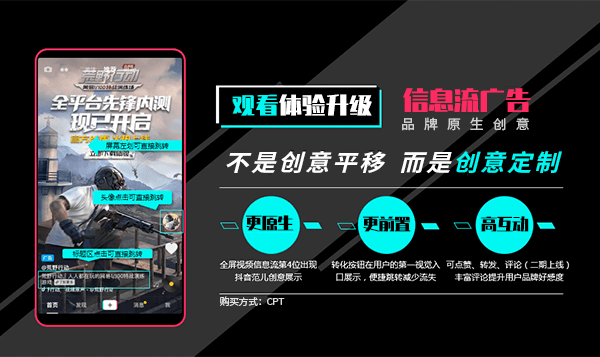 信息流廣告可以將用戶的觀看體驗(yàn)升級,在這里,短視頻的信息流廣告 不僅僅是創(chuàng)意平移,而是創(chuàng)意定制。短視頻的信息流廣告更原生、更前 置、并且還具有高互動(dòng)的特點(diǎn)。